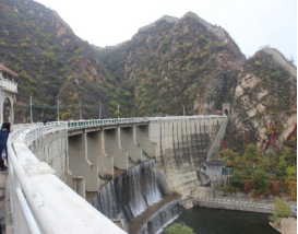 黄花城因漫山遍野的黄花得名。虽错过了长城内外花黄柳绿、莺歌燕舞的春季,但此时的水长城满眼苍绿、郁郁金黄,红叶斑斑,像极了一位害羞的少女,一抹红晕,一番别样韵味。步入正门,半山腰一座横穿仙山的山洞即是别有洞天。穿过洞道,一座壮观的拦河大坝进入我们的视线。水库大坝主体由五个泄洪孔组成,中国人喜欢将美好寓意赋予到建筑上,分别代表金、木、水、火、土,五行俱全,也含五谷(稻、黍、稷、麦、菽)丰登之意。大坝底部有水帘长廊,廊道弯曲通幽。从廊道穿行,有“水帘洞”的即视感。
