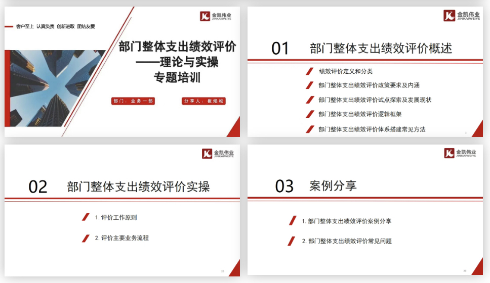 部门整体支出绩效评价涵盖了预算收支,基于部门职责和行业规划,综合考量资产和业务活动,从成本、效率、效能、社会影响、可持续性及满意度多维度评估部门绩效,以客观展现其职责履行状况。为进一步加强部门整体支出绩效评价的理论学习,提升预算绩效管理服务能力,近日,我司业务一部开展了部门整体支出绩效评价专题培训,系统地介绍了部门整体支出绩效评价的政策背景及发展历程、部门整体支出绩效评价指标体系搭建思路及常见方法、业务流程,并结合实际案例从部门整体评价指标体系搭建、现场调研等关键环节进行了详细讲解。
