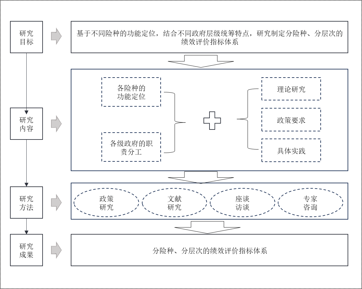 本次研究在系统梳理不同险种功能定位、不同政府层级职责分工、不同基金统筹层次的基础上,根据《指引》要求,结合内蒙古自治区各层级及全国其他省市近几年具体实践,通过政策研究、文献研究、座谈访谈、专家咨询等方式,基于不同险种、统筹层次形成社会保险基金预算绩效评价指标体系。指标体系兼顾“共性+个性”的思路。共性方面,总体采用决策、过程、产出、效益的框架体系,同一类指标评分规则和标准基本统一等;个性方面,各险种基金具体指标和评价要点根据基金自身特点及内蒙古自治区社会保险基金当前管理模式“量身打造”。