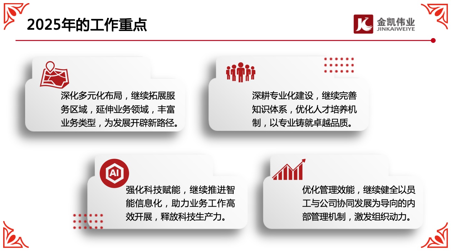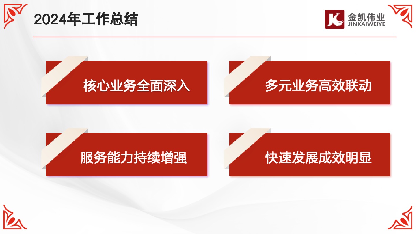 2025年1月16日至17日,金凯伟业2024年度工作总结会在北京总部方恒国际圆满完成。总公司各部门负责人、业务骨干及各分子公司主要领导齐聚一堂,全面回顾了2024年工作开展情况,总结一年来的成绩和收获,分析当前面临的困难、存在的问题与不足,共同谋划2025年工作方向与目标。