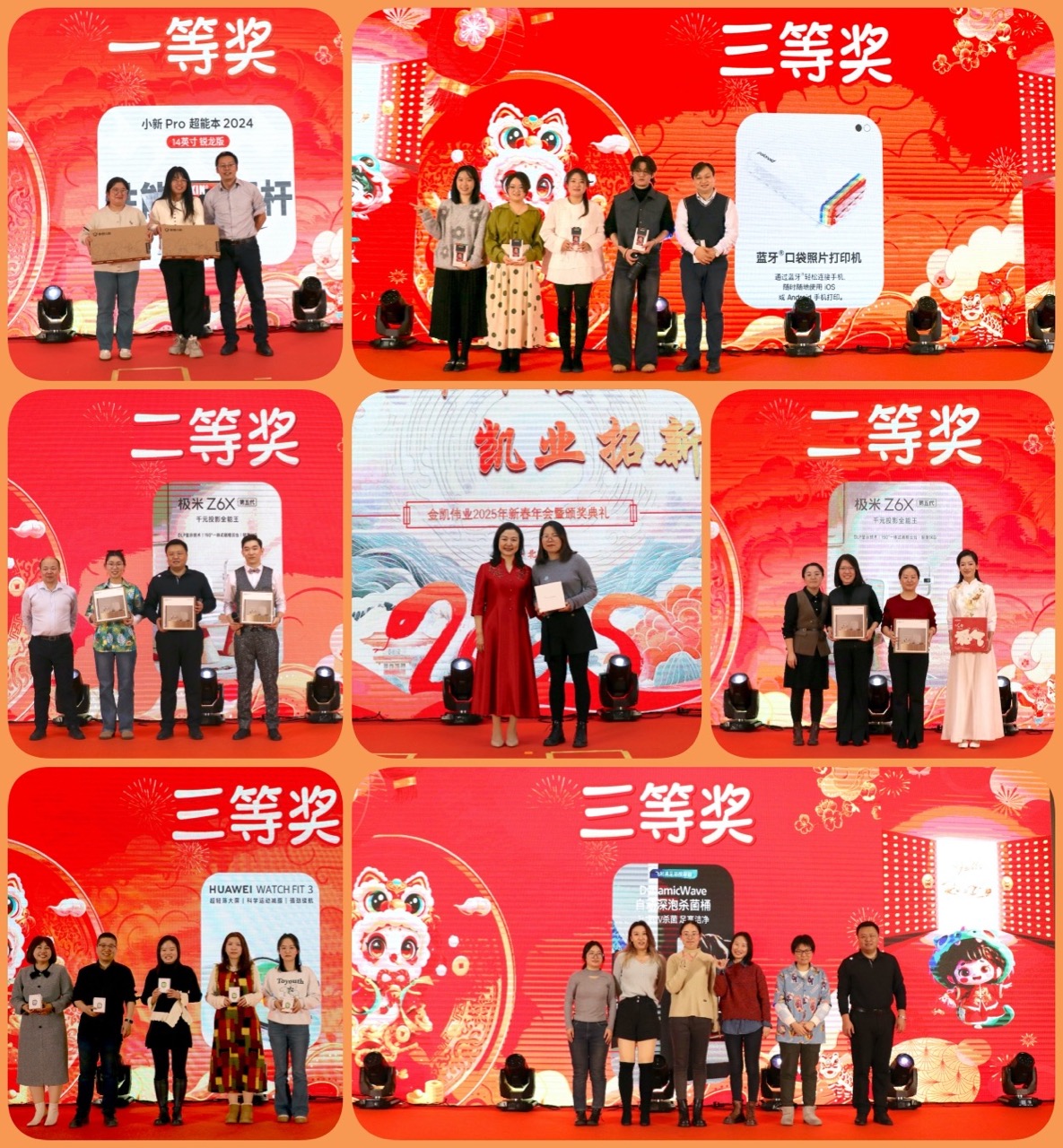 丰富有趣的游戏环节让全场金凯小伙伴们热情高涨,备受期待的抽奖环节更是一次次将现场气氛推向高潮,手机、笔记本电脑、投影仪、华为手表、照片打印机等丰厚大奖花落其主,未能中奖的小伙伴们也收获了养生壶、电炖锅、U盘、双肩背包等“阳光普照奖”~